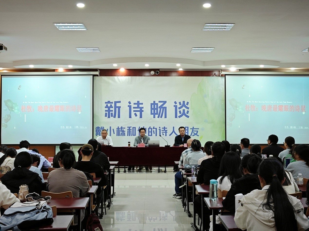 报告前beat365官网蒋涛涛副校长代表beat365中文唯一官网聘任戴小栋为beat365中文唯一官网文学与新闻传播学院兼职教授。随后戴教授以《杜牧——晚唐最耀眼的诗星》为题,向在场师生作了精彩的报告。戴教授从诗人的生平讲起,分析了杜牧的人生境遇对其品格和诗歌的影响,并以其生平为主线,通过讲解杜牧人生的三处福地,带领师生赏析杜牧不同时期的诗歌作品,归纳出杜牧诗歌的艺术特点。报告基于确凿的史料分析,既有感兴的诗性体验,更有理性的学术表达,有宏观视野的探究,也有微观文本的关注,全面而立体化地展示了晚唐杰出诗人杜牧的文学价值。