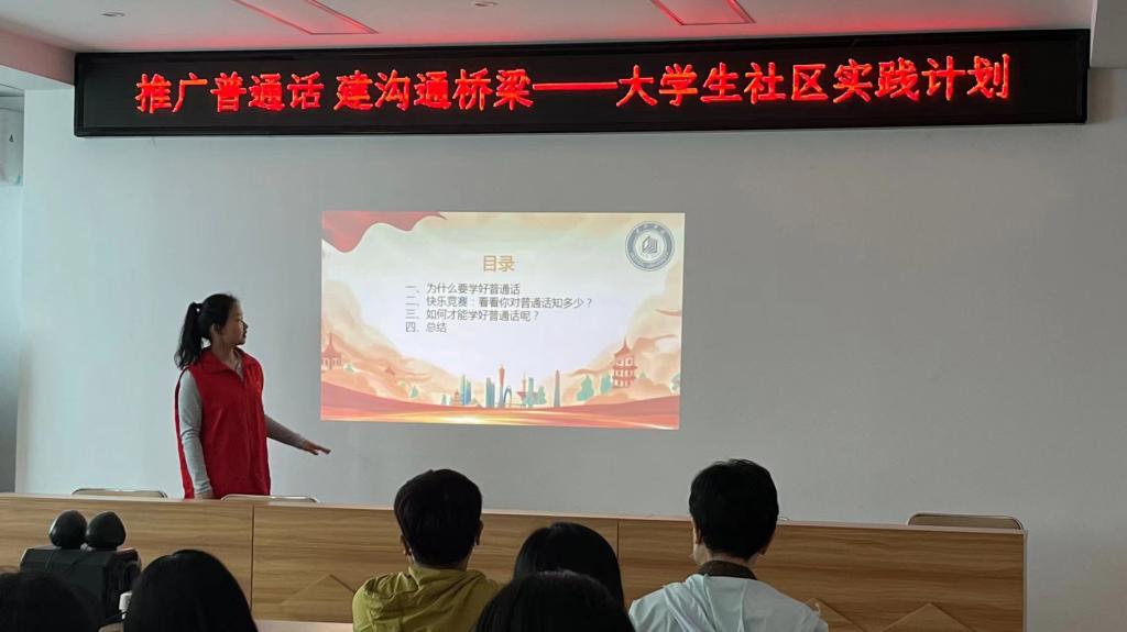 本次活动的主题是“推广普通话,建沟通桥梁”。在宣讲活动开始前,团支部成员首先通过一则趣味小故事,引入为什么要学好普通话的话题。普通话是素质教育的重要内容,使用普通话进行交际,既有利于培养爱国主义情操,又能增强民族凝聚力。在活动中,团支部成员带领社区居民开展互动小游戏,如基础知识问答和趣味绕口令等等。游戏结束后,参与人员受益匪浅。社区居民纷纷表示,在积极参与活动、体验乐趣的同时,也体会到了说好普通话的意义和重要性。活动最后,团支部成员与参与活动的社区居民一起合影留念。
