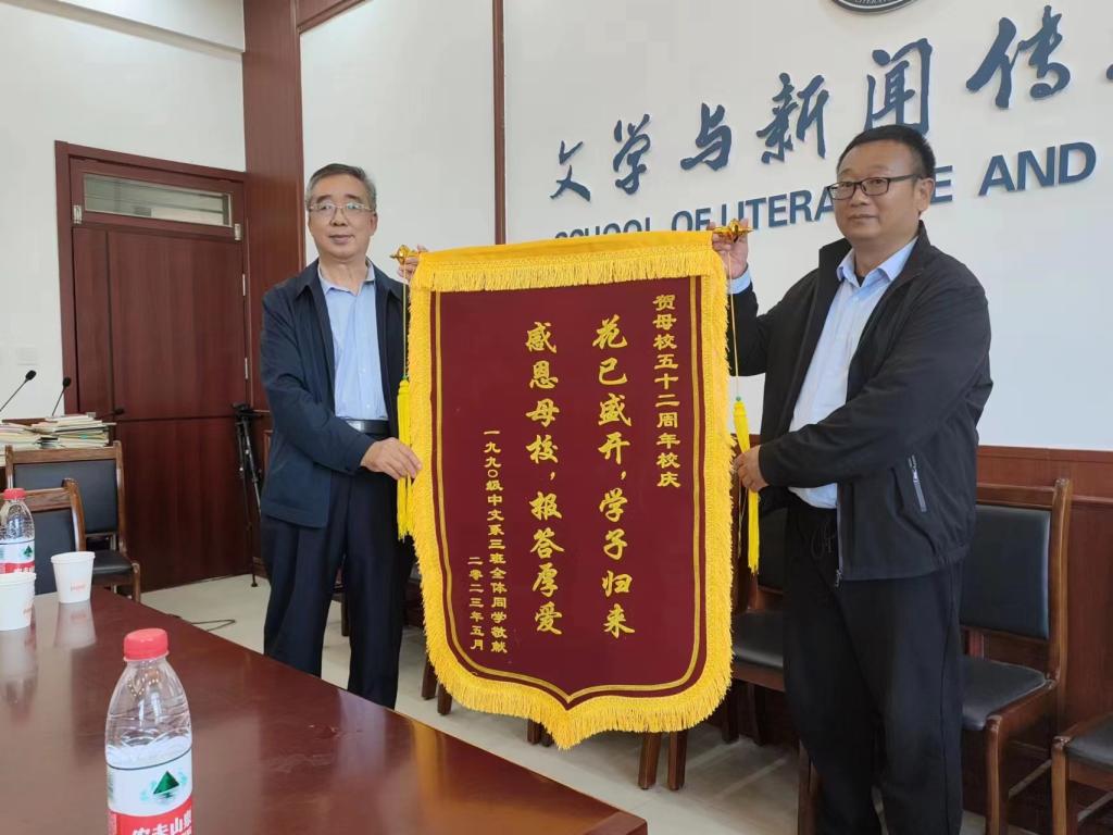 春末夏初的德院校园阳光明媚,鲜花盛开。5月7日,1990级中文系民师班20位老校友回母校参加校庆52周年“校园开放日活动。上午9点,文学院党委书记杨爱民、老书记张振安、黄金元、组织部老领导民师班班主任王朝忠准时来到学院南大门,迎候老校友们回家,随后全程陪同老校友参观了校史馆、博文楼教学区、学生宿舍楼、餐厅、操场、校友林,观赏了校园美景,历时四个多小时。所到之处,老校友们对母校发生的变化和取得的成就感到震撼。在举行的两次座谈会上,杨爱民介绍了学院概况,三位老领导满怀深情地表达了对老校友们的欢迎、关心和鼓励。回忆往昔求学时黄金岁月和校园生活点滴,老校友们激动万分,幸福满怀,年已古稀的校友代表发言时都流下了感动的泪水。活动中,老校友们集体向文学院敬送了写有“花已盛开,学子归来,感恩母校,报答厚爱”的锦旗,表达了对母校培养的感恩之情。