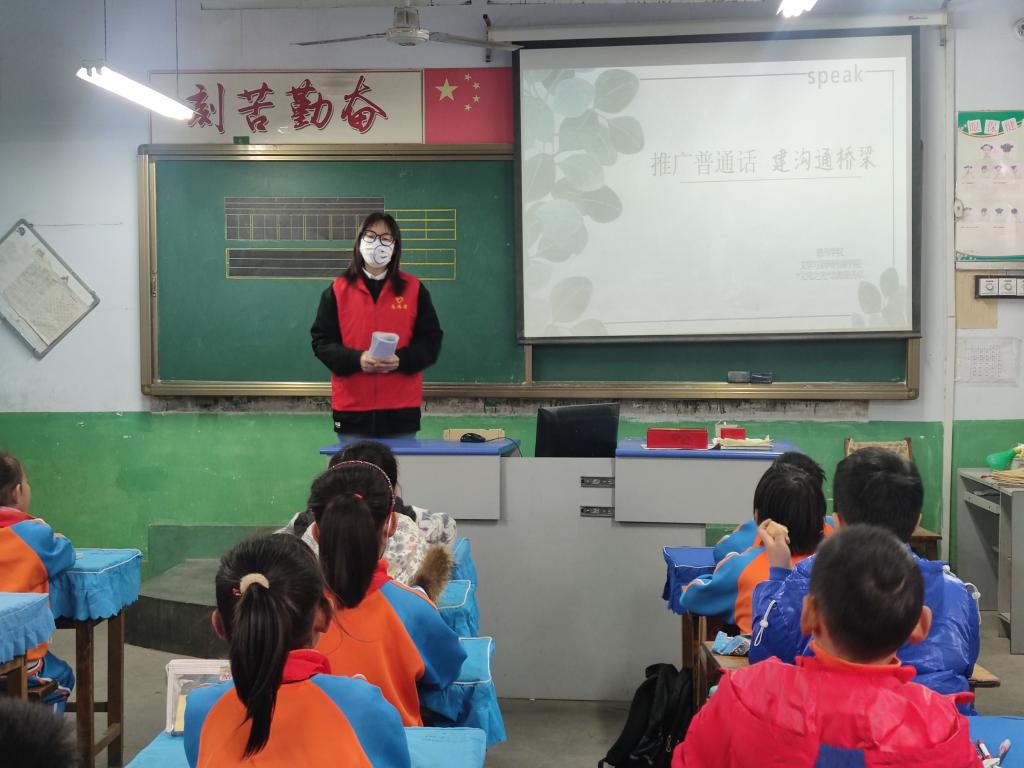 在此次活动中,志愿者们积极引导同学们仔细阅读推广普通话倡议书,推广志愿者友好热切的与同学们交流普通话相关知识,感受普通话背后所蕴含的中华魅力。推广普通话要从校内走向校外,志愿者们来到学府家园社区发放宣传单,向社区老人们宣传并倡导说普通话,居民们纷纷表示对志愿者们工作的支持,并将在今后生活中努力说好普通话。全面推广普通话应从孩子抓起,志愿者们来到常王小学,在小学生中推广普通话。志愿者们充分发挥文学院学科优势,从专业角度向学生们讲授说好普通话的方法和重要性。