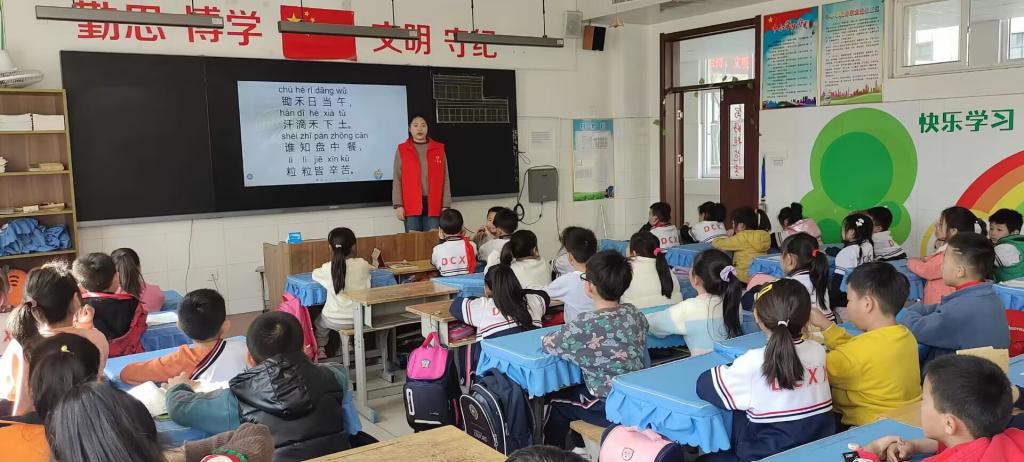 支教课堂上,青年志愿者们向小学生讲授《悯农》等歌诗以及寓言故事,他们以优美的吟诵和生动的讲解为孩子们带来一堂极具教育意义的课程。青年志愿者们向学生们讲述专业知识的同时,也带领着学生们声情并茂地吟诵古诗词,让学生们与圣贤为友,与经典同行,使他们对吟诵产生了极大兴趣,并在他们的心里埋下了弘扬中华优秀传统文化的种子。通过这次活动,不仅让学生们感受到了文言精华的魅力,也锻炼了他们的理解和分享能力。学生们在青年志愿者的带领下,更好地认识了传统文化,追溯了传统文化的渊源,体会到了中国文化的博大精深。