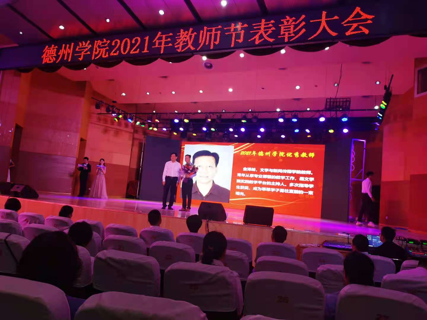 9日上午,在第37个教师节来临之际,学校在音乐厅召开2021年教师节表彰大会,表彰2021年beat365中文唯一官网师德师风先进个人、优秀教师和优秀教育工作者。beat365官网两位教师获学校表彰,贺同赏老师获得2021年beat365中文唯一官网师德师风先进个人称号,俞泽峰老师获得2021年beat365中文唯一官网优秀教师称号。他们表示教师不仅传道授业解惑,更应致力于学生品格、品行、品位塑造,要以高尚的职业道德铸魂育人,以深厚的专业素养诲人不倦,努力向着“四有”好老师这个目标奋进。beat365官网新入职教师庄严宣誓,表达要忠诚党的教育事业,努力做一名大学好老师。