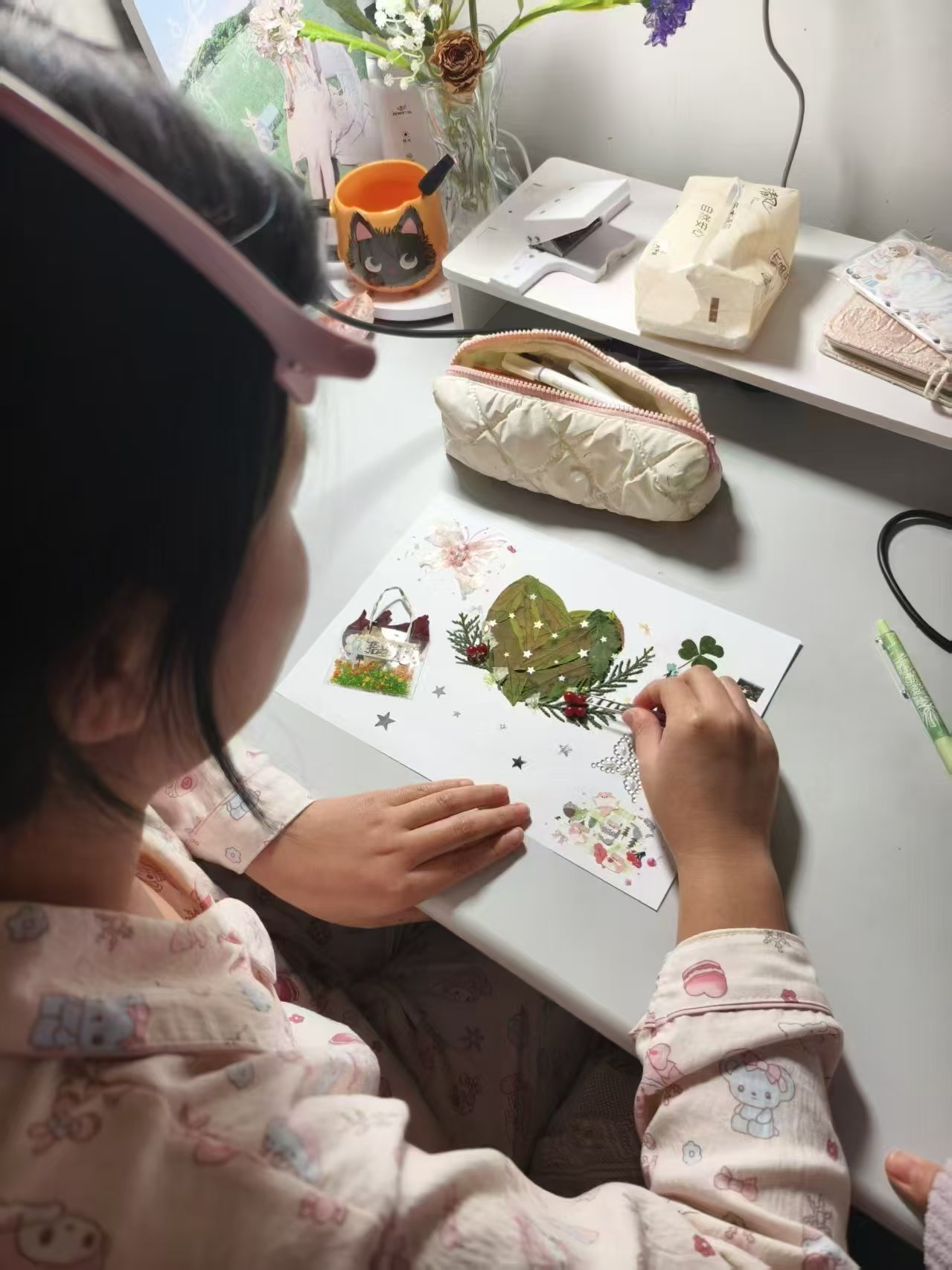 活动期间,同学们化身“秋日收藏家”,在校园里捡拾红枫、银杏叶、松果等素材,结合自身审美创作出叶脉书签、拼贴画、挂饰等作品。这些作品裹着秋日草木香,既有青春创意,又显实践热情,传递出健康向上的风貌。创作结束后,同学们互相交流,在分享中加深对自我情绪的理解,也增进了彼此的情谊。