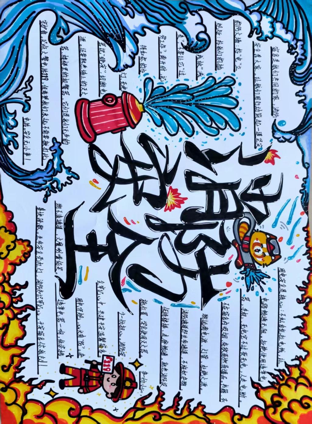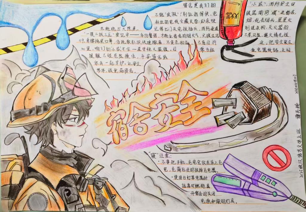 在活动期间,同学们围绕“宿舍违规电器危害”“火灾逃生技能”“消防器材使用规范”等主题进行了创作。短视频作品通过自编自导的微剧情,生动展现宿舍消防隐患的防范方法,兼顾趣味性与科普性;手抄报作品以手绘漫画和醒目警示标语相结合,将安全知识转化为具体行动指南;板绘作品则运用高饱和度色彩突出视觉重点,将“禁止私拉电线”“不占用消防通道”等安全规范以直观图像呈现,增强知识的表现力与记忆点。同学们在展示与交流中各抒己见,各类特色作品共同构筑起宿舍安全的生动风景。