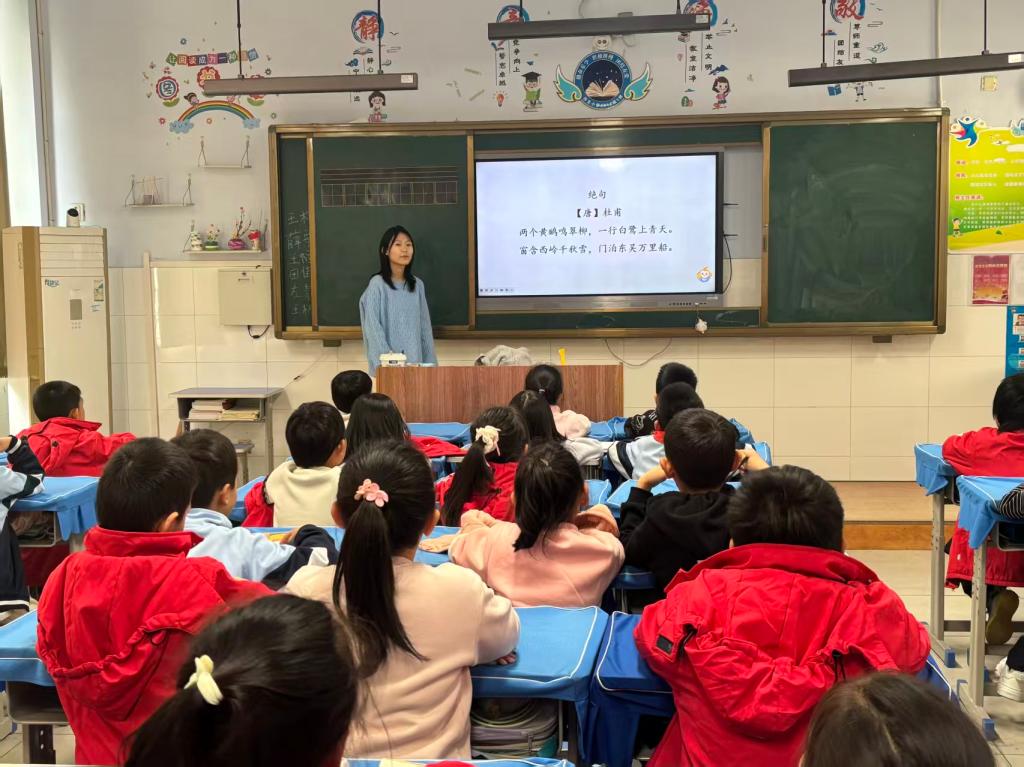 志愿服务方面,社团持续走进沙王小学、东七小学开展支教活动。志愿者们开设古诗词专题课堂,带领孩子们品读经典、学习吟诵技巧,并手把手指导节目排练。课堂上,志愿者通过逐句领读、韵律讲解、情境演绎等方式,引导孩子们感受诗词的节奏与情感;孩子们从跟读到主动吟诵,从理解字句到体会意境,逐步融入古典诗歌的世界。