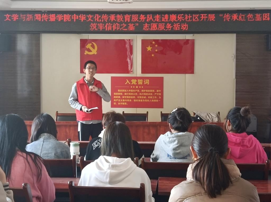 为了传承红色基因,弘扬革命精神,3月19日,文学与新闻传播学院中华文化传承教育服务队走进康乐社区开展“传承红色基因,筑牢信仰之基”志愿服务活动。