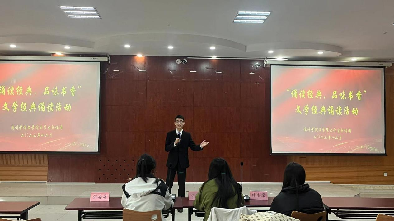 此次活动意在通过诵读加深学生对经典文学作品的了解和热爱,提高个人文学素养。 此次活动中同学们积极响应、踊跃参与,以其充沛饱满的感情,自信大方的形象赢得评委与观众们的阵阵掌声。活动内容和形式丰富多彩,有的吟唱青春,引导同学们奋进向上,勇敢拼搏;有的歌颂伟人,让同学们探寻理想的光辉与生命的价值;有的赞咏祖国,在高昂激荡的配乐中,带着同学们踏上中华民族伟大复兴之路……千年流传的文化古韵,伴着铿锵有力的声音,为校园增添了浓厚的文化韵味。同学们精神饱满,朗读时字正腔圆、抑扬顿挫、声情并茂,各有特色,既注重美文诵读方法和技巧的把握,也能把握文本的内涵,呈现出文学经典的光辉。