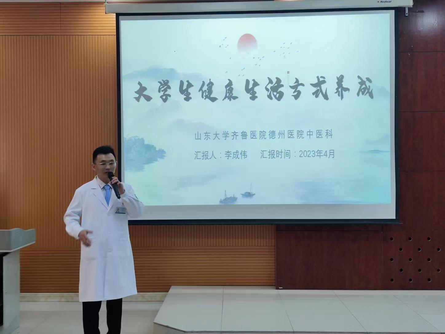 李成伟医师执业十余年,全国名中医专家传承工作室骨干成员,德州市首届卫生与健康杰青人才,从业经验丰富。他从真实的临床病例出发,针对当代大学生不良生活习惯引发的诸多问题,向同学们讲解了其危害,从传统中医角度出发,警醒大学生们要法于天地,合于阴阳,食饮有节,起居有常,重视身体健康,养成良好的生活方式。讲座最后,李医师现场为同学们诊脉,讲解,得到了同学们的广泛参与和普遍好评。