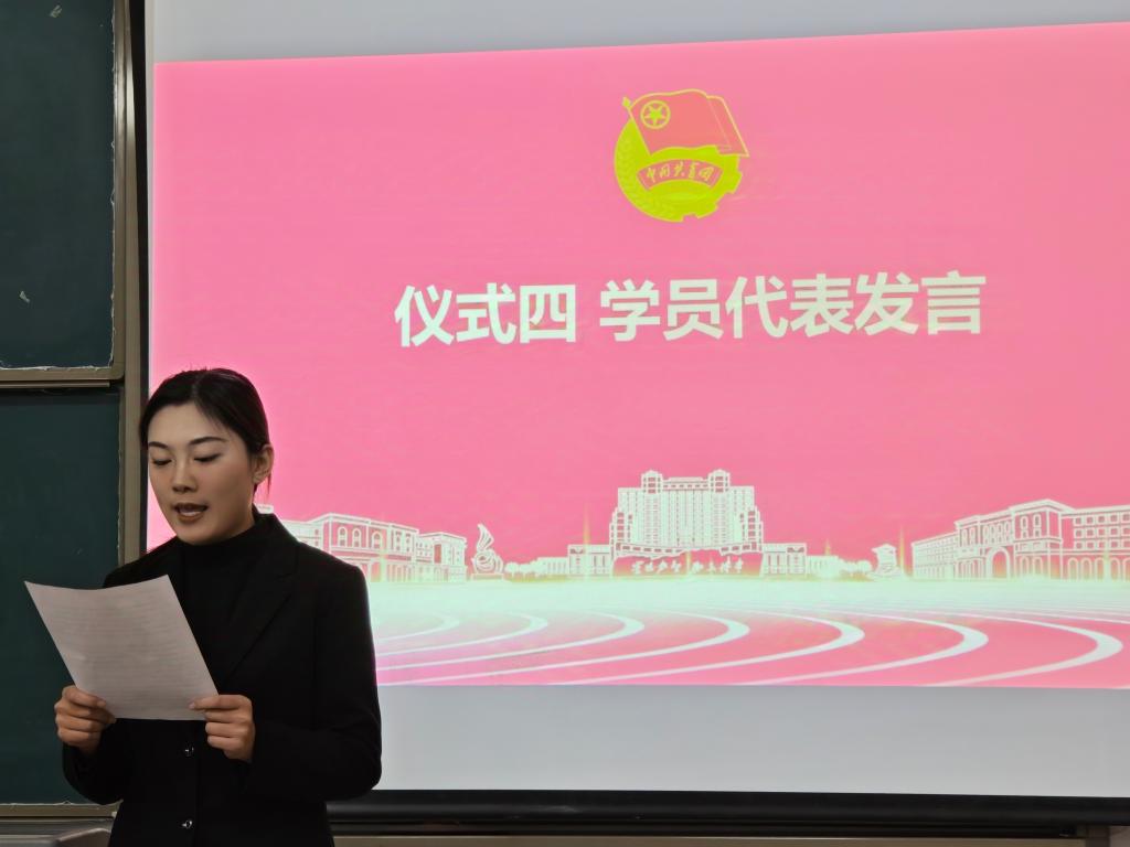 学生代表李沁桐发言,她表示青马班是一个帮助大家提升思想、锻炼能力的宝贵平台。她号召同学们珍惜机会、认真学习、积极实践、团结互助,并代表全体学员承诺将严守纪律、全力以赴,未来用所学知识为建设国家贡献青春力量。