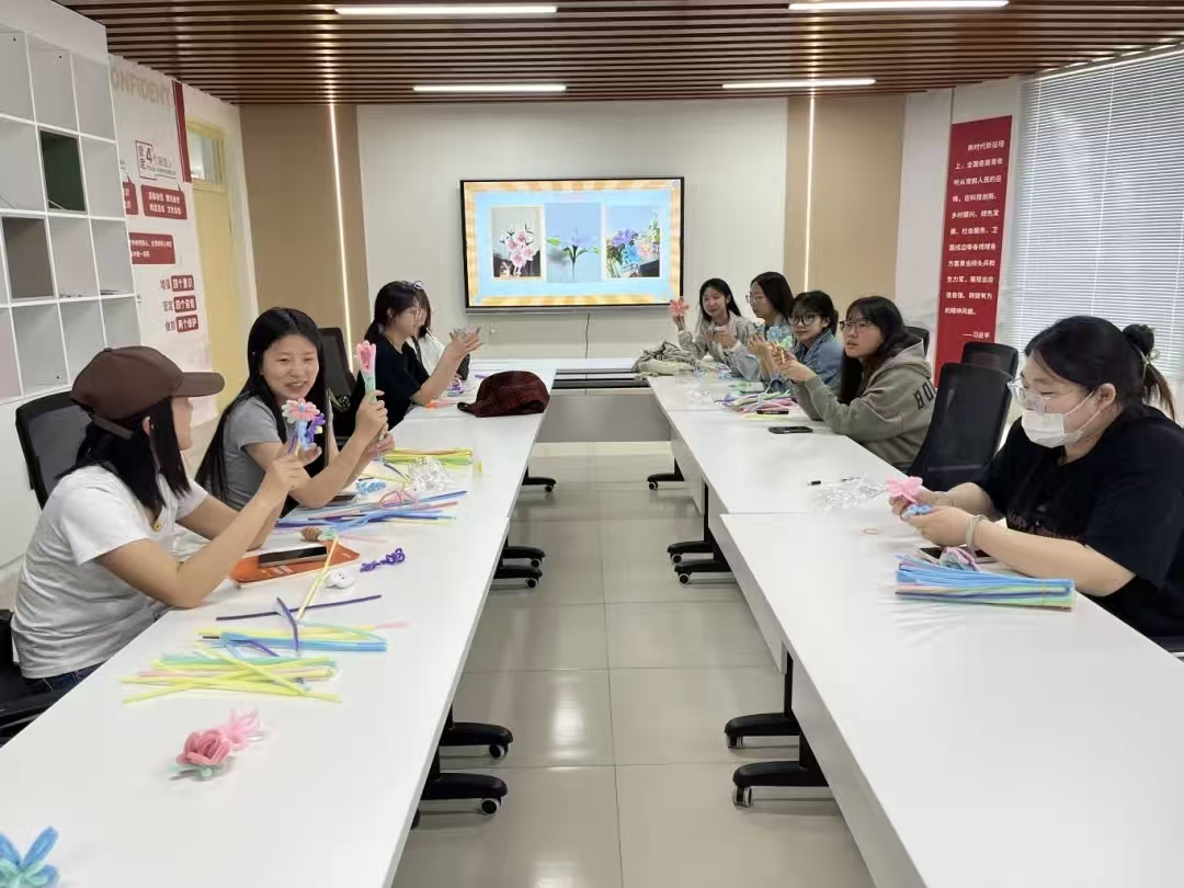 活动中,主持人通过鲜活的案例带领同学们系统学习了劳模精神中爱岗敬业、争创一流、艰苦奋斗、勇于创新、淡泊名利、甘于奉献的深刻内涵,引发了在场学生的强烈共鸣。理论学习结束后,手工制作环节随即展开。同学们迫不及待地拿起色彩缤纷的扭扭棒,专注投入到创作中。他们灵活地将扭扭棒弯折、缠绕、塑形,有人先将红色扭扭棒拧出螺旋状,精心雕琢成玫瑰花瓣的弧度;有人用黄色扭扭棒卷出向日葵的花盘,再用绿色扭扭棒制作出细长的茎叶。制作过程中,大家相互交流技巧,互相帮助调整造型,现场气氛热烈。完成花朵后,同学们又认真写下“以劳动书写荣光”“致敬平凡中的伟大”等真挚寄语,将对劳模的崇敬之情融入每一份手工作品中。
