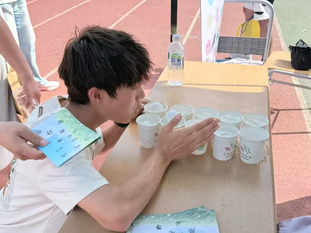 活动当日,现场气氛热烈非凡,三个精心设计的趣味环节依次展开,掀起阵阵欢乐浪潮。在“同心弹弹圈”环节中,同学们紧握系在弹弹圈的绳索,齐声喊着节奏口号,通过默契配合控制鼓面起伏,让小球在鼓面上欢快弹跳,不断挑战颠球新纪录。“巧艺扭趣,趣扭万象”环节则成为创意的舞台,彩色扭扭棒在同学们手中化身魔法材料,娇艳的花朵、灵动的蝴蝶、精致的手链等手工作品纷纷诞生。而“球跃星河挑战赛”更是将现场氛围推向高潮,同学们鼓足干劲,俯身将乒乓球依次吹过装满水的纸杯,有人不小心吹洒水花引得哄堂大笑,有人一气呵成完成挑战收获欢呼喝彩。游戏结束后,大家齐聚展板前,拿起画笔共同创作,用缤纷色彩勾勒出一张张灿烂笑脸,分享活动中的趣事与感动,将美好瞬间永久定格。